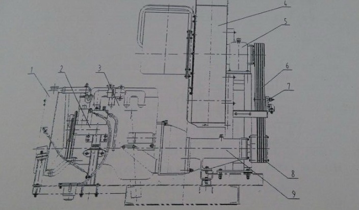 1、散熱水箱 2、液壓泵 3、副發動機 4、風機 5、風機軸承座 6、窄V帶 7、皮帶張緊裝置 8、自動離合器 9、傳動軸總承成