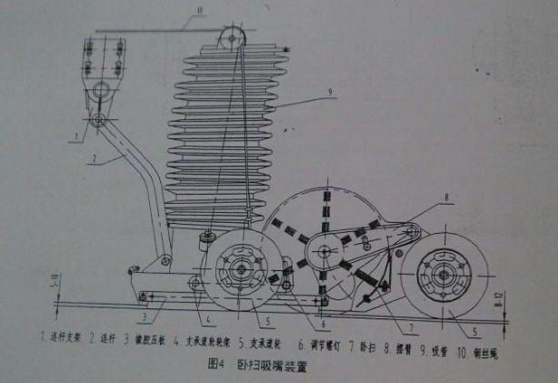 掃盤式,右傾角調整:松開掃盤傾角調節螺栓(圖5序號11),將掃盤外傾2度至4度,然后鎖緊螺母,使其沿聯接處的滑槽外滑或下旋(加長螺桿下部長度)降低掃盤高度到合適位置,再將鎖緊螺母,其次,再調節螺紋筒(圖5序號9),調節掃刷接地壓力,使掃刷觸地壓力適當。