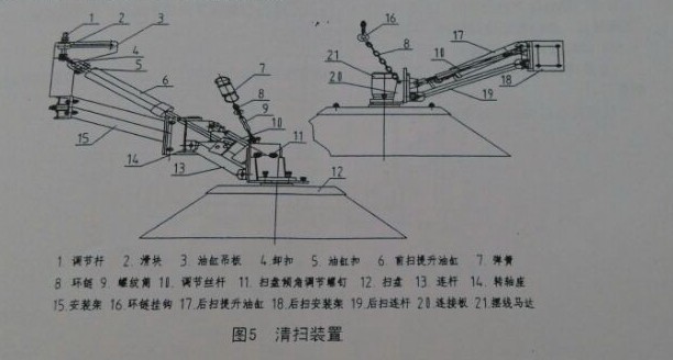 先將后掃提升油缸(圖5序號17)伸到最長,適當調節環鏈(圖5序號8)長度并上下調節環鏈掛鉤(圖5序號16),可降低掃盤高度和調節掃刷接地壓力。