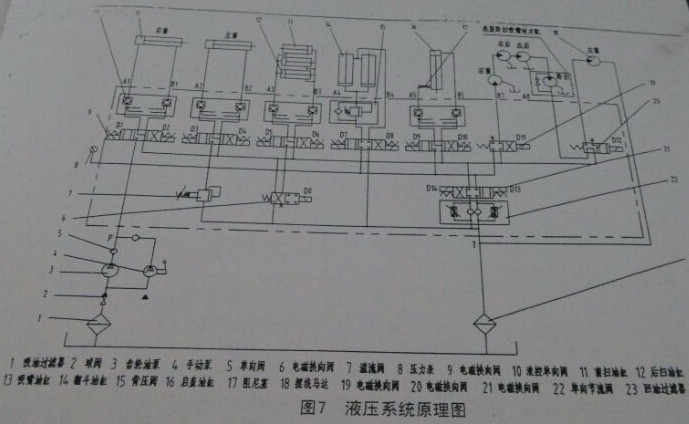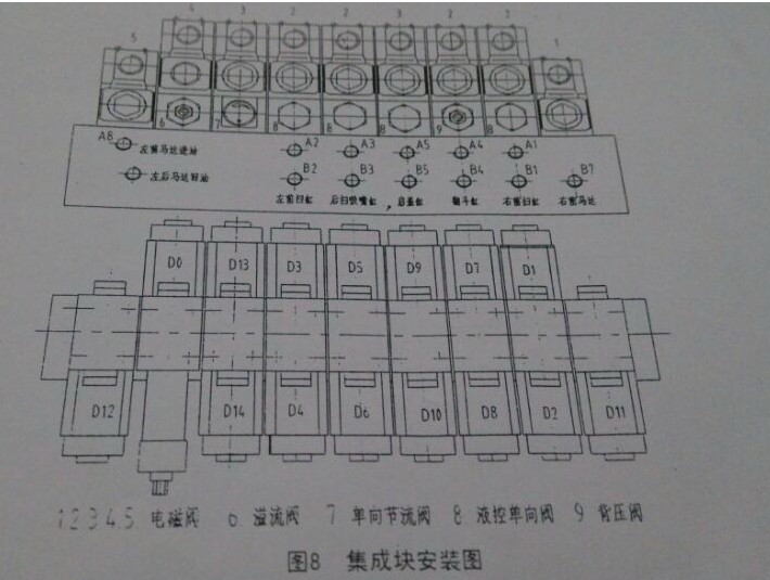 液壓系統:液壓系統由液壓泵,液壓馬達,液壓缸,溢流閥,節流閥,液控單向閥,背壓閥,集成塊,手動泵,液壓油箱,連接油管等組成,其原理見圖7(圖7小雙點劃線方框內選裝臥掃吸嘴時增加的元件),集成塊安裝見圖8。