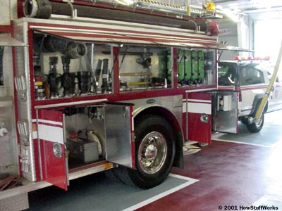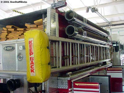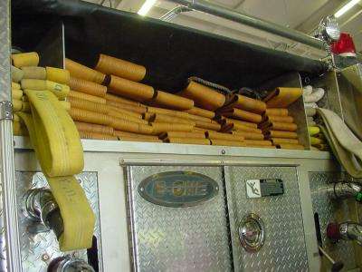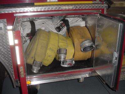 響應著火的房子時,消防隊員將立即拉斷軟管crosslay。 這些線被直接位于下方的泵面板。 他們奠定了在開啟和輕,所以他們很容易下車攻擊火災消防車。 的crosslays 200英尺(61米)長,有一個直徑為1.5英寸,可以在每分鐘95加侖(360升)噴水。 對于較小的火災,如小柴火或煙囪火災,小增壓線是足夠的。 甲升壓線是最小的軟管在卡車上,并有一個直徑約1英寸。