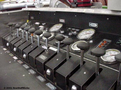 您可以控制使用卡車的泵消防車頂部面板上的軟管。 該泵的面板是一系列杠桿和開關控制多少水是流動的,哪些線正在被排出。 到達火場時,司機會跳出,爬上貨車頂部開始泵運行。 指標 - 系列泵面板上的紅燈 - 讓運營商知道油箱中剩余多少水。