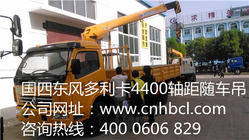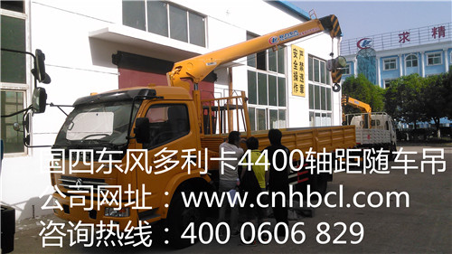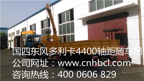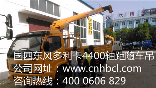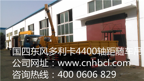 國四東風多利卡4400軸距廂長5.1米隨車吊配置參數,采用東風多利卡原廠底盤,單排帶翻轉駕駛室.東風5檔,4400軸距、國四高壓共軌、朝柴120馬力發動機,輪胎8.25-16、單排、帶動轉,貨廂尺寸(mm): 5200,5100X2150X550.裝配程力威3.5噸二節直臂吊機,全液壓,全回轉,工半徑5.38米,舉升高度7.3米,H式液壓前支腿,跨距3.1米,4400軸距隨車起重運輸車圖片展示:
