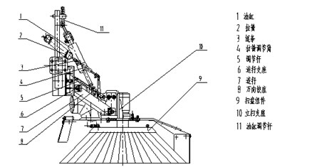 如圖所示,避讓機構由油缸1、調節桿5和連桿7組成。調節桿5和連桿7一端均與固定架鉸接,另一端與掃盤組件9鉸接。掃盤組件9通過調節桿5和連桿7組成的平行四邊形機構來實現上下平移運動,同時通過連桿支座實現水平旋轉運動。油缸1一端鉸接在油缸調節桿11上,另一端鉸接在萬向鉸座8上。掃盤組件9的外伸下降和內收提升動作由油缸1控制。在固定架和連桿7之間設置了拉簧2,拉簧2上端固定在車架上,下端與連桿7相連。利用拉簧的拉力使掃盤組件9保持在預定位置,調節拉簧調節筒4可改變彈簧2拉力的大小。