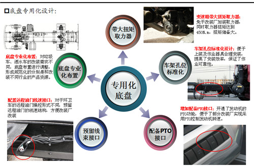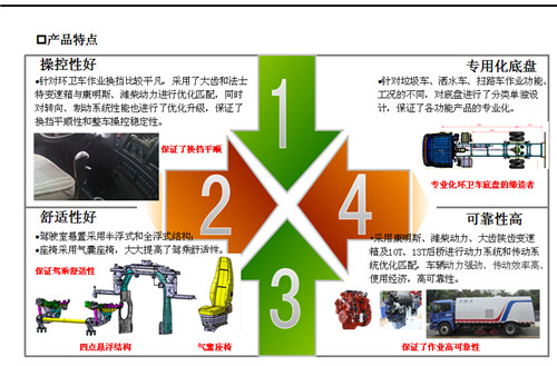 專用化底盤:針對垃圾車、灑水車、掃路車作業功能、工況的不同,對底盤進行了分類單獨設計,保證了各功能產品的專業化。