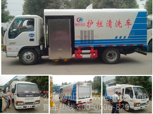 國四3方慶鈴五十鈴100P護欄清洗車選用慶鈴五十鈴底盤,慶鈴五十鈴100P國四底盤配98馬力4JB1CN五十鈴發動機,配置五十鈴MSB五檔變速器、冷暖空調、方向助力、前橋2.5噸,后橋4.8噸,700-16尼龍胎,罐體容積3立方. 是新一代多功能公路設施清洗設備。它可全自動高速的擦洗城市道路各種型式的隔離護欄,適用于城市道路隔離護欄、道路兩側墻體的刷洗。
