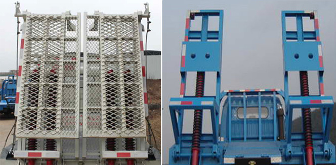 此款藍(lán)牌挖機(jī)運(yùn)輸車可設(shè)計(jì)成向后伸長500mm,可運(yùn)載80-120挖機(jī),平板面采用5mm厚國標(biāo)花紋板,橫梁采用100x100x5的國標(biāo)方管,橫梁加密,每300mm一根橫梁,邊框使用120槽鋼固定,平板運(yùn)輸車的承載能力更大,受力更均勻;尾部帶有雙彈簧爬梯和可折疊式支腿,爬梯上焊有16的螺旋鋼,板面上也焊有螺旋鋼,挖機(jī)上去的時(shí)候不會(huì)打滑,在挖機(jī)上去的時(shí)候?qū)⒅确畔拢?點(diǎn)著力,車頭不會(huì)翹起,安全性能更強(qiáng)。