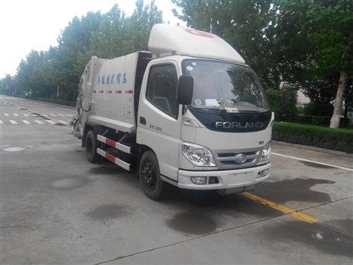 3、國四福田時代小卡之星3壓縮式垃圾車(4方),整車型號:BJ5046ZYS-X1型壓縮式垃圾車,底盤型號:BJ1046V9JB4-X1,整車外形尺寸:5720X1860X2360(mm),壓縮垃圾箱采用加強梁和鋼板焊接而成牢固的框架結構,外形美觀,重量輕,受力好,不變形;推鏟由鋼管骨架和折面板構成,不僅結構輕巧,又能使垃圾均勻分布,卸料干凈徹底;填裝器主要由填裝器殼體、滑板、刮板等構件組成,各構件采用受力良好的梁板或箱型結構,結構牢固,重量輕;為了提高使用壽命,對箱體進行了磷化防銹處理,并噴涂防銹底漆。利用電控和液壓控制的優點,通過控制轉換,保證了各機構動作準確可靠,提高了使用可靠性和效率;采用了先進的液壓舉升安全回路。其原理是在液壓系統中的舉升油缸上設置了單向平衡閥。該閥隔斷了舉升油缸與液壓膠管的直接連接,即使油管爆裂,填裝器也不會突然落下造成惡性事故,提高了使用安全性。壓縮垃圾車尾部可選裝翻桶(斗)機構裝卸,不會對操作人員造成污染。箱與填裝器之間采用特制橡膠條密封,密封性好,杜絕了二次污染。