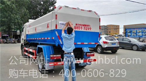司機(jī)正在為這臺(tái)8方側(cè)裝掛桶式垃圾車貼臨時(shí)牌照