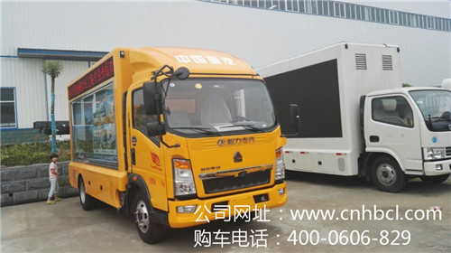 國四重汽豪沃P8LED廣告車整車型號:CLW5040XXCZ4型宣傳車 ,底盤型號:ZZ1047C3414D145,整車尺寸:5995X2030X3050(mm),這款國四藍牌LED廣告車底盤采用重汽豪沃1880單排駕駛室,錫柴87馬力國四發動機,5檔變速箱,7.00-16輪胎,動轉,斷氣剎,軸距:3360mm,這款國四LED廣告車右屏為條屏字幕加滾動燈箱如圖: