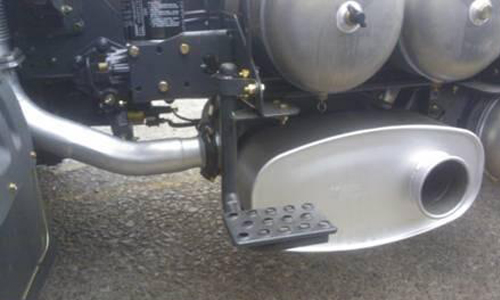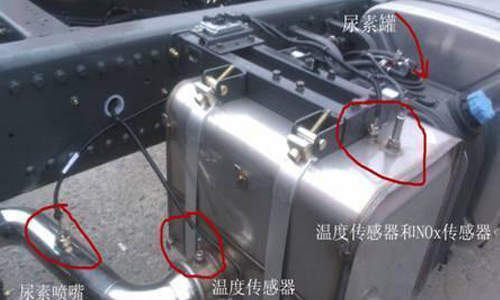 一是國四車與國三車加油裝置多一個尿素罐,也就是在油箱旁邊的罐罐。油箱左邊這個小罐,加尿素液有點麻煩要去專門的地方。按照咱家新政策的情況來看,目前大概100升油用5升尿素。二是國四車消聲器變化比較大,新加了尿素噴嘴和一些傳感器。