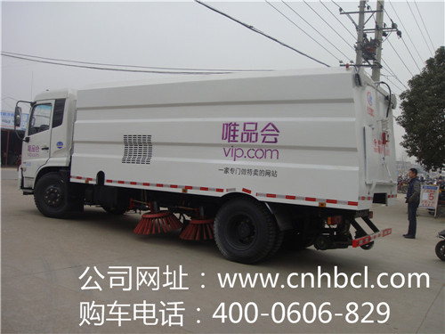 湖北程力東風天錦掃路車的車身印有唯品會標簽及網址 東風天錦掃路車:是湖北程力最大型的掃路車,東風天錦豪華排半可前翻駕駛室,6檔變速箱,原裝空調,加厚高強度前保險杠,前霧燈,可調水晶大燈,廣角后視鏡,前路面視鏡,9.00-20原廠尼龍胎,中冷增壓,康明斯180馬力國四發動機,軸距4500,DF6S750變速箱,帶空調。4.5T前橋,9T后橋。