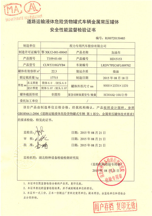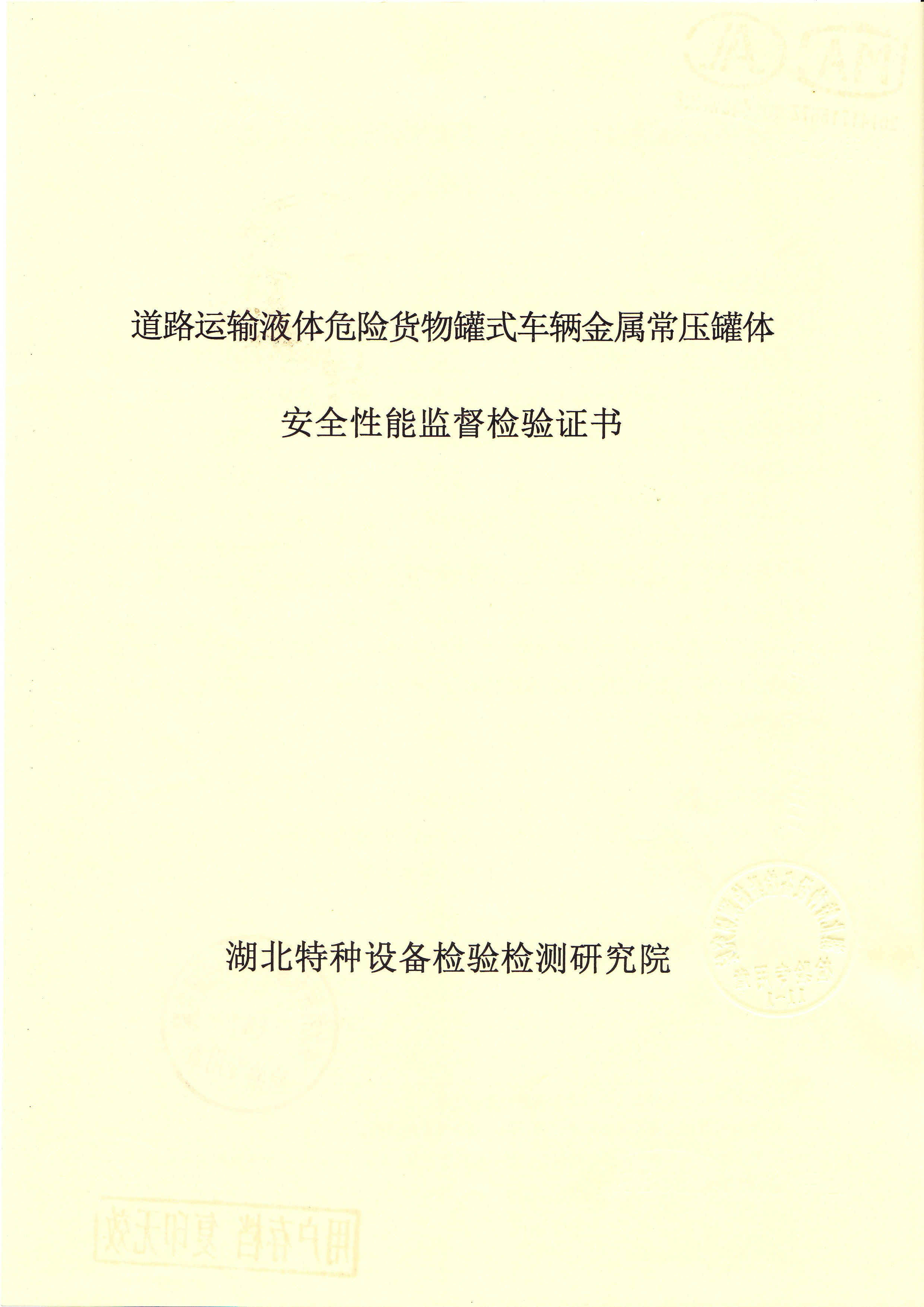 歐曼前四后六加油車容積22.5方罐體檢驗證書