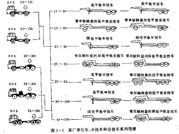 (3)針對專用汽車品種多,批量少的生產特點,專用汽車設計應考慮產品的系列化,以便根據不同用戶的需要而能很快的進行產品型圖1-1為某廠牽此車,半掛車和全掛車系列型譜。對專用汽車零部件的設計,應按“三化”的要求進行,最大限底地選 用標準件,或選用已經定型產品的零部件,盡量減少自制件。