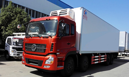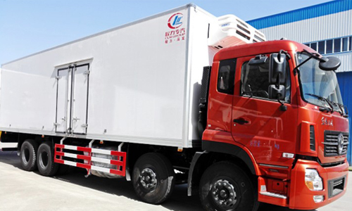 東風天龍前四后八冷藏車:廂體尺寸9400X2400X2450(mm)。 總質量:31000kg;額定載質量:17155kg;整備質量:14680kg。