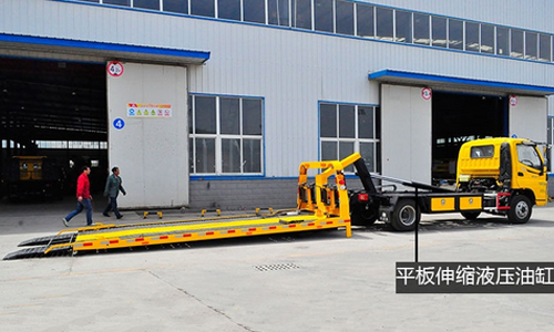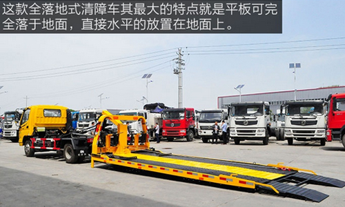 這款全落地式清障車其最大的特點就是平板可完全落于地面,直接水平的放置在地面上,從而可以處理底盤較低的各類小型故障轎車,實現(xiàn)一般平板清障車無法完成的低底盤車輛的拖運工作。