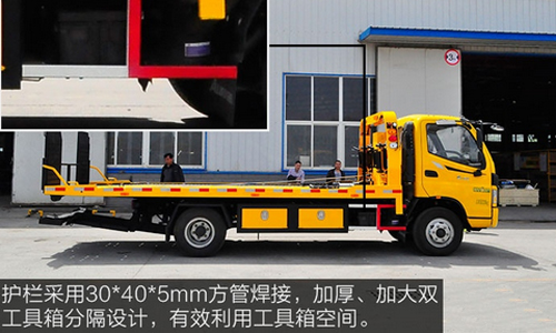 平板伸縮油缸及托臂托舉油缸都進行加粗設(shè)計,有效地避免了平板伸縮發(fā)抖、后托舉無力的現(xiàn)象,提高了作業(yè)效率,擴大救援范圍。最值得一提的當屬該車的噴漆工藝了,采用拋丸、電泳(目前國內(nèi)只有2家企業(yè)使用有該工藝)、烤漆(進行有3層噴漆處理,從底層上漆到表層上漆再到最后的烤漆)、噴砂處理,使平板耐酸堿、防滑、延長使用壽命。護欄采用30*40*5mm方管焊接,加厚、加大雙工具箱分隔設(shè)計,有效利用工具箱空間,易損件和金屬件分開存放,避免額外的損失。