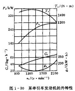 在外特性圖上,發動機的輸出轉矩和輸出功率隨發動機轉速變化的二條重要特性曲線(見圖1-30),為非線性曲線。工程實踐表明,可用二次三項式來描述汽車發動機的外特性,即