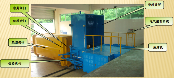 我公司生產的分體式垃圾壓縮中轉設備由壓縮機、進料裝置、鎖緊機構、液壓系統、電氣控制系統、垃圾集裝箱等組成。
