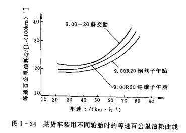 圖1-34為某貨車裝用不同輪胎時的等速百公里油耗曲線。