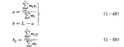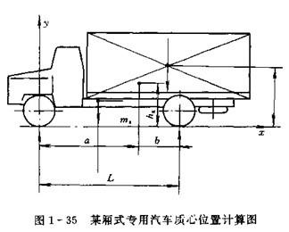 計(jì)算時(shí)可根據(jù)已有的資料,或利用試驗(yàn)結(jié)果,也可用計(jì)算方法來(lái)確定專(zhuān)用車(chē)各總成的質(zhì)量及其質(zhì)心位置坐標(biāo),然后按照力矩平衡方程式,求出整車(chē)的質(zhì)心位置。對(duì)圖1-35廂式貨車(chē)縱向和高度的質(zhì)心座標(biāo)計(jì)算,有: