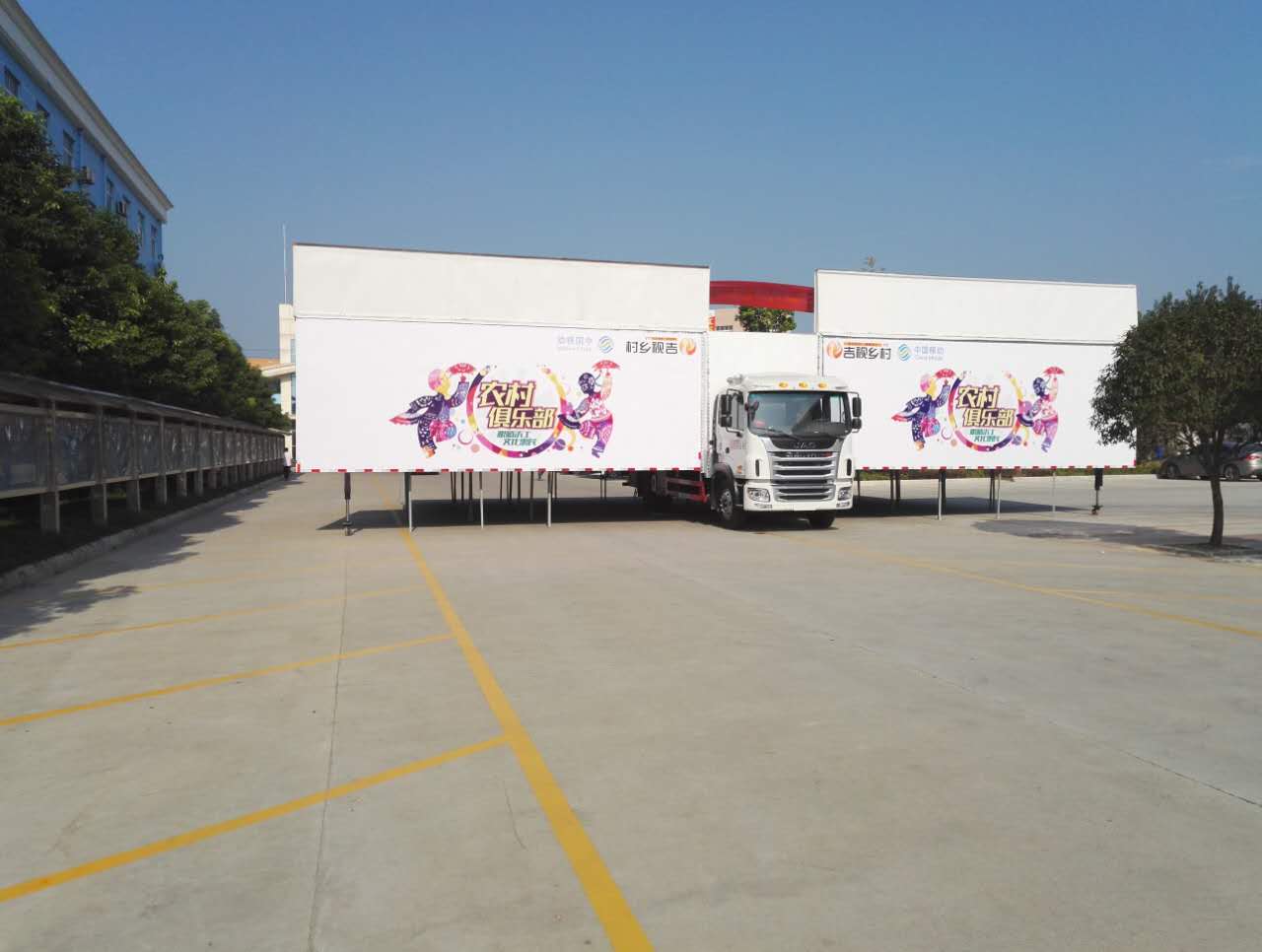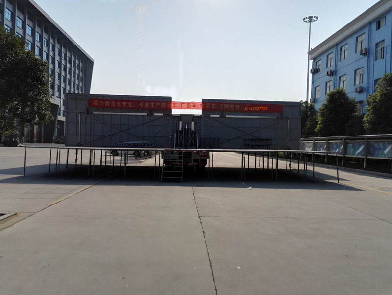日前我公司根據客戶的要求構想,設計生產出超大型流動舞臺車140平方,這臺全國最大的流動舞臺車走進了喜林,這款大型流動舞臺車選用江淮格爾發國五采用濰柴165馬力,采用箱體全部展開的形式,做到舞臺最大話,演出完成后舞臺會通過液壓系統收回,從而合攏成箱體。使車輛面積運用到最大化,到達140平方。