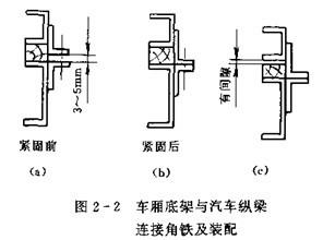 車(chē)廂與底盤(pán)的連接實(shí)際上就是將車(chē)廂底架(副車(chē)架)縱梁緊固在底盤(pán)的縱梁上,一般同時(shí)采用角鐵連接與傳統(tǒng)的U型螺栓連接,以提高連接的可靠性,角鐵連接如圖2-2所示,為避免出現(xiàn)裝配后連接面產(chǎn)生間隙(圖2-2(c)),緊固前,上下角鐵之前應(yīng)有合適的間隙(圖2-2(a)),緊固后保證連接面能緊密貼合(圖2-2(b)).