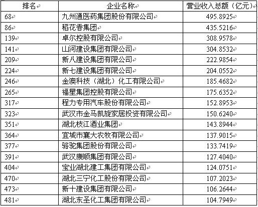 我省入圍的18家企業(yè)分別是:九州通(68位)、稻花香(86位)、卓爾控股(139位)、山河建設(shè)集團(tuán)(141位)、新八建設(shè)集團(tuán)(209位)、新七建設(shè)集團(tuán)(224位)、金澳科技(246位)、福星集團(tuán)(265位)、程力專汽(317位)、金馬凱旋(323位)、枝江酒業(yè)(351位)、襄大農(nóng)牧(364位)、駱駝股份(377位)、康順集團(tuán)(391位)、寶業(yè)湖北建工(404位)、三寧化工(470位)、新十建設(shè)集團(tuán)(473位)、東圣化工(481位)。