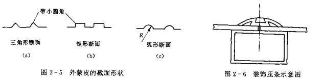 蒙皮通常采用0.8-1.5mm厚的薄鋼板,但也有采用鋁板或玻璃板。非金屬蒙皮厚度為2-3mm.為了提高蒙破的剛度,往往事先在薄板上壓制成截面形狀各異的加強(qiáng)筋(見圖2-5)。從提高剛度考慮,弧形最佳,其次是三角形和矩形。