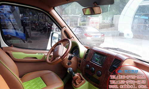 前排駕駛室內(nèi)保留了輕客車型大部分的設(shè)計,功能區(qū)域上劃分清晰;中控臺上雖然配備了6.5寸多媒體觸控屏,但相對面積較大的中控臺,還是顯得略微空曠一些,配備的導航倒車影像一體機,方便出行時使用,方向盤集成了多媒體控制以及定速巡航功能。
