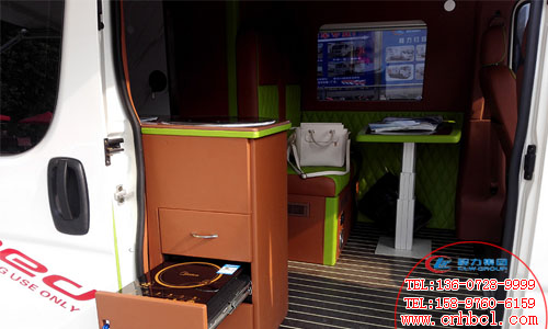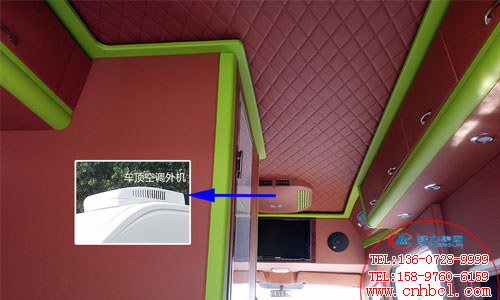 這款東風御風配備了AC220V駐車空調(diào),吊柜及衛(wèi)生間邊緣全部采用了淡綠色包邊,顯得清新時尚,頂部也采用了軟包裝飾,四周集成了豪華星空燈及氛圍燈,駕駛室頂部配17寸液晶電視,戶外可以觀看電視節(jié)目。