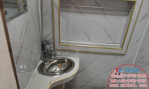 衛(wèi)生間配備的是電動沖洗馬桶,還有一個洗手盆,墻上有一面浴鏡,頂部有雙向換氣扇,雙源12V/220V熱水器為日常洗漱和淋浴提供了方便,房車露營的話,這樣的衛(wèi)生間也是不可少的。