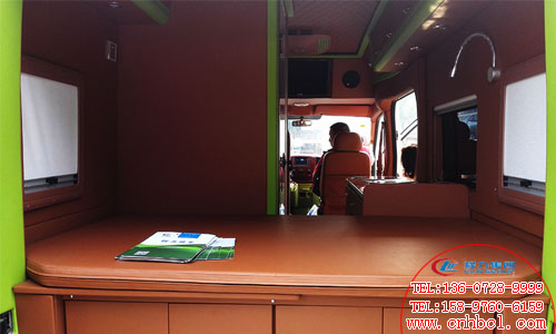 后置雙人床采用高檔床墊,非常舒適,床兩頭上方均安裝有中空雙層有機玻璃推拉窗,帶紗窗及遮陽簾,既可以保持車內(nèi)通風也可以提供一個私密空間。床兩頭配有充電插座和閱讀燈,很方便。