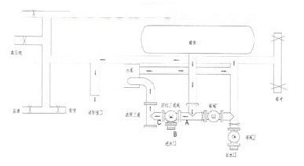 進水口位置接通水源,在出水口的位置接通儲存水容器,將四位三通閥的標記擰到A位置,使B-C相通,打開球閥2,關閉球閥1及所有灑水噴頭,拉動取力器開關,使水泵開始工作即可起到泵站的作用,停止工作時各開關回位。其工作水路示意圖如圖所示。