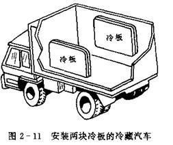 冷板的數量和布置主要取決于車廂容積的大小,微型冷藏汽車一般僅在廂內前壁安裝一塊冷板,輕型冷藏汽車需裝2-3塊,中型冷藏汽車需裝3-5塊,重型冷藏汽車則不少于6塊。當廂內采用2塊以上冷板時,廂內兩側壁安裝的冷板應該對稱布置。圖2-11為采用兩塊冷板的冷藏汽車廂內布置。