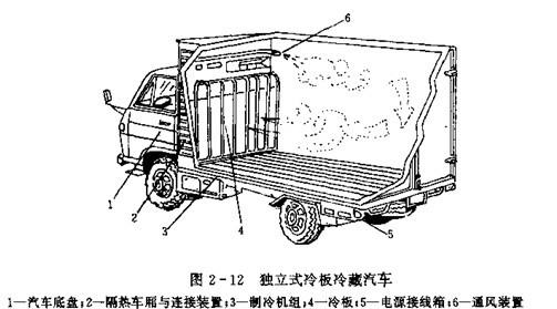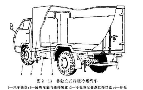 (1)獨立式冷板冷藏汽車(圖2-12),獨立式冷板冷藏汽車在車廂內除裝有冷板外,還裝有對冷板進行“充冷”的制冷機組。需要時,僅需接通地面上的電源,即可自行對冷板進行充冷。圖2-12所示制冷機組3布置在車架縱梁左外側,若此處不便布置,亦可將制冷機組布置在車廂膠壁上方。