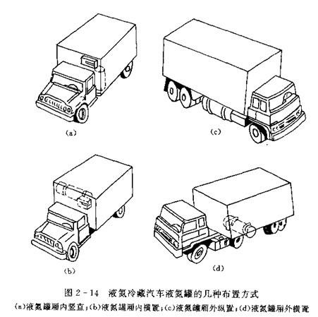 液氮冷藏較小,因此,液氮罐往往安裝在廂內;豎裝液氮罐多裝在廂內間側(圖2-14(a)),橫裝液氮多裝在廂內前壁上方(圖2-14(b))。液氮罐布置在廂內,優點是結構緊湊,安裝方便,但是,罐體占用了一部分廂體裝載容積。中,重型液氮冷藏汽車的液氮罐盡寸較大,通常安裝在車廂下面的汽車縱梁上,液氮罐在縱梁上的布置又可分為縱置式和橫置式兩種(圖2-14(c)(d))。