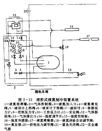 液控式液氮制冷裝置系統如圖2-15所示。液氮制冷裝置主要由液氮容器(罐)1、氣體控制箱,2、溫度控制板,15、液氮噴淋部件和安全通氣窗22等組成。
