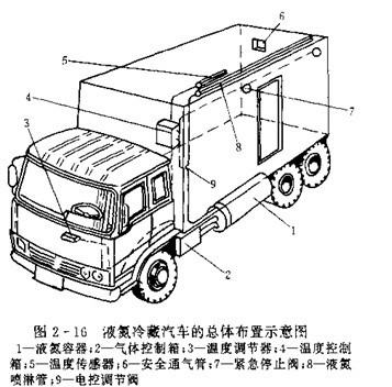圖2-16為液氮冷藏汽車的總體布置示意圖。圖中,液氮容器1臥裝在底盤左側。氣體控制箱2安裝在液氮容器正前方。溫度控制箱4裝于車廂前壁的左上側,溫度調節器3裝在駕駛室內,因此,操作者可在駕駛室內直接控制液氮系統的工作,溫度傳感器5裝于廂內頂部。液氮噴淋部件由噴淋管8、電控調節閥9與緊急停止開關7組成。緊急停止開關裝于廂門側旁,與廂門聯動。當廂門打開時,通過緊急停止開關使電控調節閥9關閉,整個系統的制冷暫時停止。安全通氣窗6裝于車廂后門,以保證廂內氣壓不超過規定值。