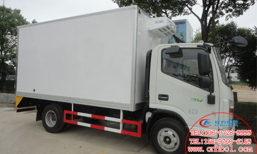 國五冷藏車廂體內部尺寸:4015×2060×2000mm, 廂體采用三明治結構,內外飾1.2mm鋁合金板蒙皮;中間夾層保溫材料采用聚氨酯切片真空負壓一次復合成型;厚度8cm, 符合國家衛生部頒布食品等級要求,具有強度高、耐腐蝕、抗老化、導熱性能低、無污染、不容易損壞等特點,底板為鋁合金防滑花紋板,保證底板保溫性能及底板的抗沖擊強度。雙后開門門框架全部采用不銹鋼制成的整體框架,門板重量輕,防腐性能好。雙后門中縫帶斜度,開關方便。門邊框密封采用進口優質橡膠(三元乙丙)密封條進行密封,保證廂體保溫效果的穩定性,門邊,門鎖及附件均為不銹鋼制作。