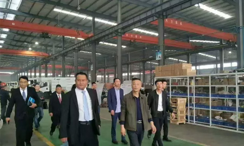 程力集團(tuán)公司常務(wù)副總經(jīng)理程國祥(前右)帶領(lǐng)考察團(tuán)參觀生產(chǎn)車間
