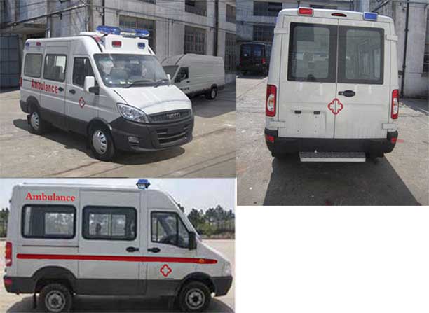 依維柯轉運型救護車基本配置清單:1、便捷折疊擔架,2、醫藥柜1件,3、固定安裝氧氣瓶1只,4、輸液吊構2只,5、消毒燈1只,6、污物桶1只,7、單人座椅2只,8、長條座椅2人位軟座墊,軟靠背和安全帶1套,9、中隔斷帶滑窗一套,10、前頂裝全藍警燈警報器1套,11、12V照明燈2只,12、500W逆變器1只,13、220V電源插座1組,14、醫用耐磨塑膠地板革,15、貼救護十字標志,16、后艙空調和暖風。