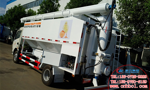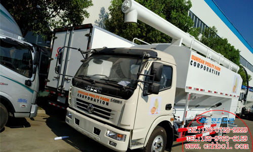 散裝飼料車的飼料罐架設在卡車的底盤上,罐頂開有進料口.頂部的一根螺旋輸送卸料管(俗稱卸料絞龍)則可自由回轉和抬升,抬升的仰角可達60度。運輸時,頂部的螺旋管平臥在罐頂;卸料時則抬起,使管端的出料口與畜禽飼養場貯料罐頂部的進料門相接,駕駛室內裝有操縱裝置(操縱裝置也可裝置在罐體尾部),卸料時通過車底的動力輸出軸和減速器來驅動螺旋,以完成卸料。下圖為出口亞州東風多利卡散裝飼料運輸車圖片: