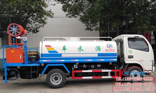 整車配置參數:東風多利卡底盤,朝柴102馬力或玉柴115馬力國五發動機,軸距3308mm,5立方灑水罐,罐體5MM厚,前沖后灑,帶后操作平臺,帶高壓水槍,揚程28米,帶自吸功能,消防接口。選裝配置水平射程25-45米風送式噴霧機。