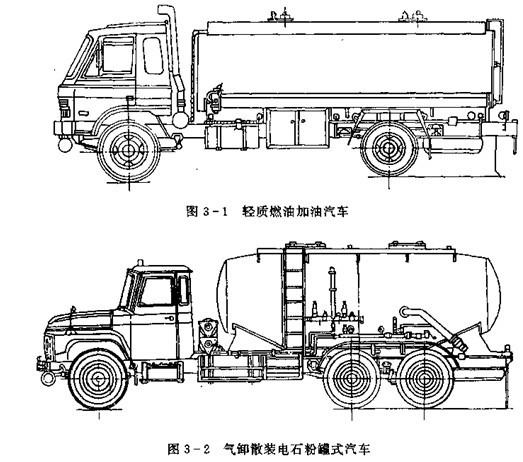 用于裝運液體物質的罐式汽車,如裝運水(水罐車),輕質燃油,潤滑油,酸類,欽料(鮮奶運輸車),牛奶(奶罐車),灑類等罐式汽車。圖3-1為輕質燃油加油汽車外形圖。