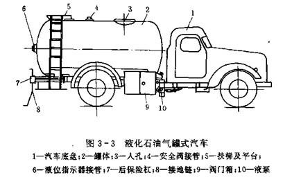 用于裝運液化氣體的罐式汽車,如裝運液化石油氣,液氮,液氧等的罐式汽車。圖3-3為液化石油氣罐式汽車。