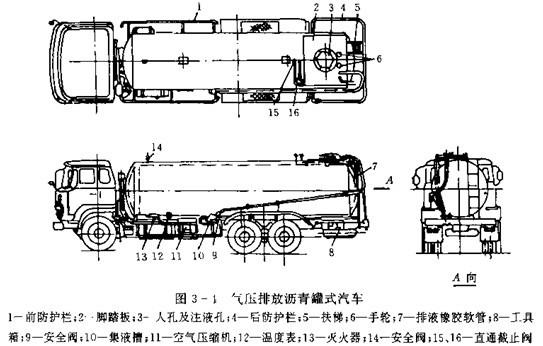 能完成某種作業的罐式汽車,如灑水車,瀝青灑布車等。圖3-4 為氣壓排放瀝青罐式汽車。罐體外設有隔熱裝置,罐體無自吸能力,瀝青注放是用地面瀝青泵壓入的,排放由汽車上的氣壓排放系統排出。