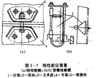 (三)罐體支承座固定裝置。圖3-7(a)為剛性聯(lián)鎖,聯(lián)接塊分別裝在支承座和車架上,然后用螺栓,螺母將兩者剛懷地聯(lián)接起來。圖3-7(b)為U型螺栓聯(lián)鎖,直接將支承座和車架聯(lián)接在一起,是普遍采用的一種固定裝置。