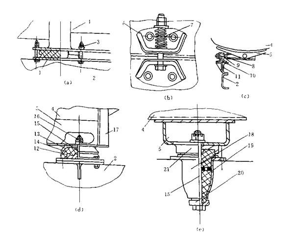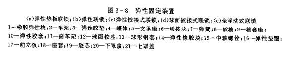 圖3-8為彈性固定裝置。圖3-8(a)為彈性墊板聯(lián)鎖,在支承座和車架之間墊上具有彈性的軟墊(如硬橡膠,軟塑料,木塊或紙板),再用螺栓或U型螺栓聯(lián)鎖。這種彈性墊能緩沖罐體支承座的動載荷。若在螺栓兩端裝上彈性墊圈,緩沖效果更好。圖3-8(b)為彈簧聯(lián)鎖,聯(lián)接塊通過彈簧,螺栓,螺母成彈性聯(lián)鎖。這種聯(lián)鎖不單獨使用,常與剛性聯(lián)鎖配合使用。圖3-8(c)為彈性鉸接式聯(lián)鎖,彈性膠軸套10襯在軸套座9與鉸軸8之前,軸套座兩端固定在車架2或副車架11上。罐體支承座5與鉸軸8鉸接。在受外力作用或汽車底盤受到扭矩作用時,由于軸8在彈性膠軸套10中有一定的自由度,因此罐體不會受扭矩,若罐體支 承座前部采用彈性鉸接式聯(lián)鎖,且置于車架中間,支承座后部采用兩組其它的固定型式,使支承座形成三點支承,效果更佳。圖3-8(d)為球面鉸接式聯(lián)鎖,裝在車架上的球面鉸座12與焊在支承座5上的球形鋼罩13套合著一個彈性橡膠塊14,用螺母鎖定。中軸螺栓能作多向活動,起緩沖作用。這種聯(lián)鎖方式常用于重型液罐車,越野液罐車上。圖3-87(e)為全浮動式聯(lián)鎖,中間有帶孔隔板的膠芯19安裝在座套18內(nèi),用上,下罩蓋21和20及中軸螺栓15固定。當(dāng)中軸螺栓受力時,膠芯19可起緩沖,吸振作用。