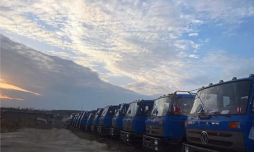 曙光初照,程力公司這批跨國外援的市政環衛專用汽車在出發前,排列整齊靜靜地等待遠行的集結號吹響。